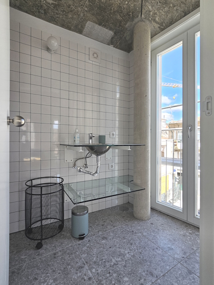 The new street facade has a simple, slightly unbalanced composition: three smaller windows on one side taking its size from the old part of the elevation, two bigger openings of the same proportion on the other end. The facade facing the plaza is exceptional and almost temple-like. It has only two openings, the disproportionately tall entrance door and one big living room window. The black and white marble cornice and the plinth wrap around the building as unifying elements. The wall above the cornice is treated in a different way using two tones of white plaster to create a soft pattern.