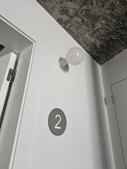 The contradiction of different systems and orders finds its expression in the materiality of the project. The continuous white surface of kinked, distorted walls contrasts with the rough texture of concrete columns. The horizontal surface of the ceiling is blue, the floor has a striped wood pattern rotated depending on the geometry of the room.